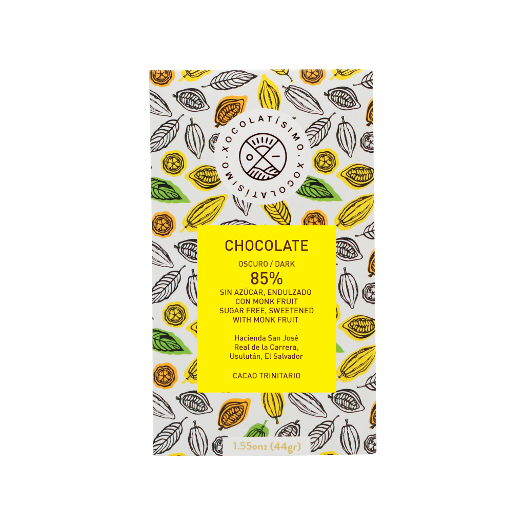 Chocolate con 85% de cacao con luohan guo (monkfruit). Cacao trinitario 100% salvadoreño de origen único (single origin), Hacienda San José del Real de la Carrera, Usulután, El Salvador. 44 gr.